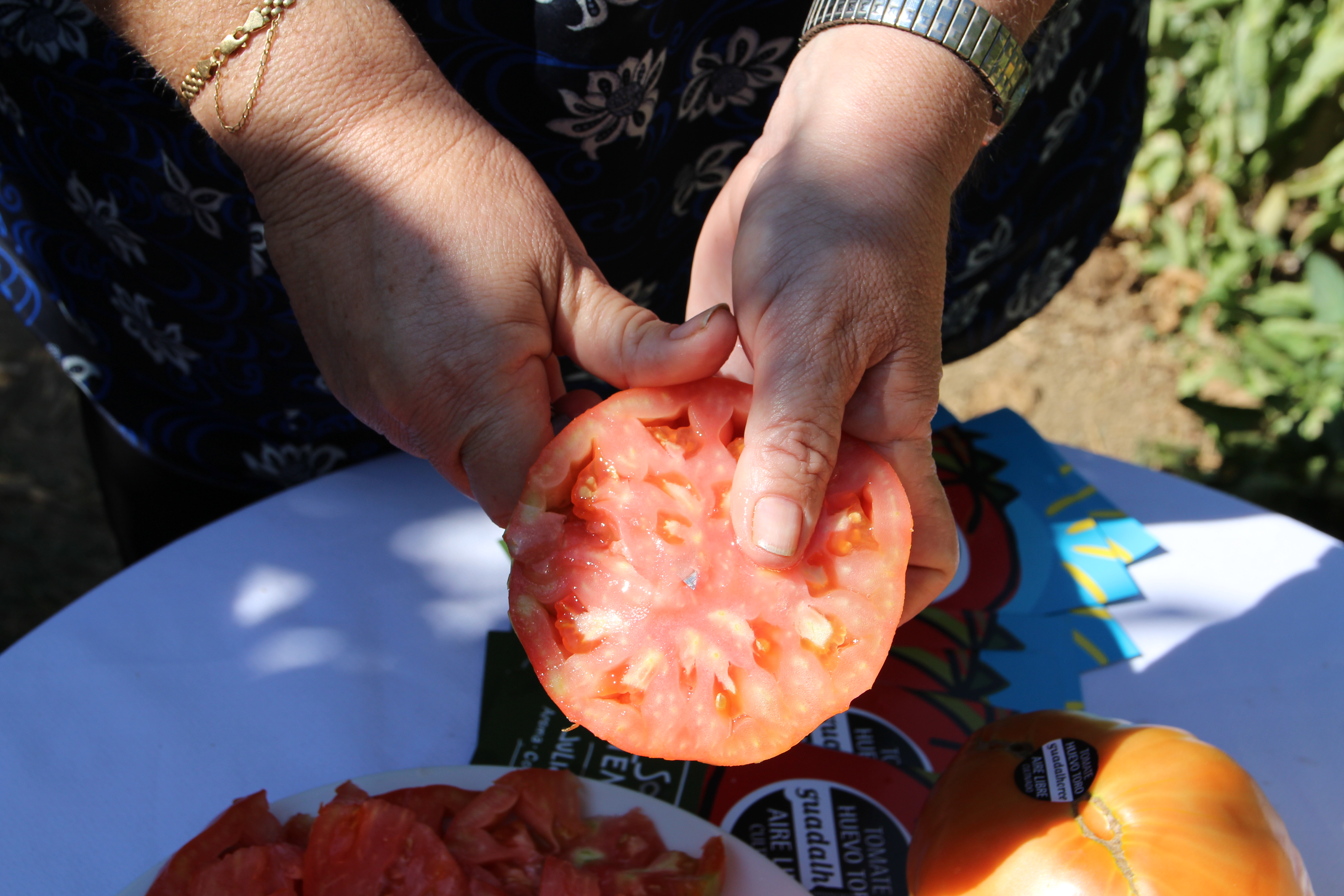 A continuación, las personas asistentes han podido degustar unos tomates recién cogidos de las matas, momento en el que han podido apreciar con total naturalidad el sabor y las cualidades de esta fruta. Tanto Pepe Cobos como Antonio Villalba han destacado la importancia de consumir y valorar los productos de nuestra huerta y la necesidad de concienciar al sector hostelero para que se prioricen frente al resto.
